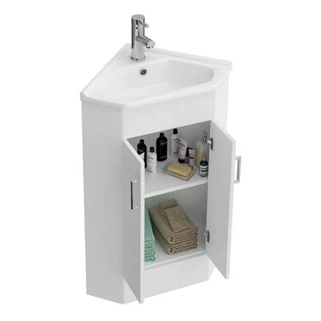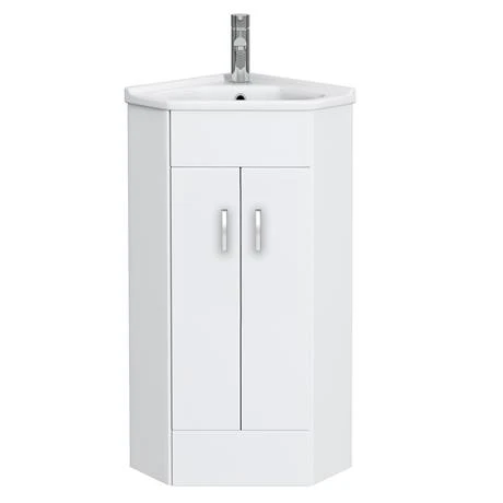 Are you working with a compact bathroom? The Alaska Cabinet Unit slots seamlessly into the corner, freeing up precious space. Just 555mm wide, this corner vanity unit packs in an internal shelf along with a one tap hole ceramic sink. The unit has a high gloss white finish, creating a contemporary aesthetic that will integrate seamlessly with other similarly smooth, glossy pieces from the Alaska range.