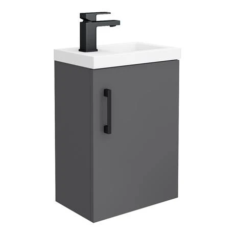 • Enhance your bathroom with the Apollo2 405mm Gloss Grey Compact Wall Hung Vanity Unit, featuring a stylish matt black handle for a modern touch.