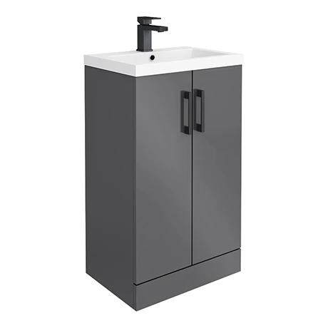 Apollo2 modular bathroom furniture combines a designer look with practical storage. All modular furniture cabinets are pre-constructed and feature integrated soft close hinges and drawers as standard to maximise your enjoyment and minimise unwanted noise. From the modular family the Apollo2 range creates a modern and clean look, this stylish 2 door floor standing unit comes in a Gloss Grey finish and contemporary matt black D type handles. Comes supplied with a single tap hole poly marble basin.
