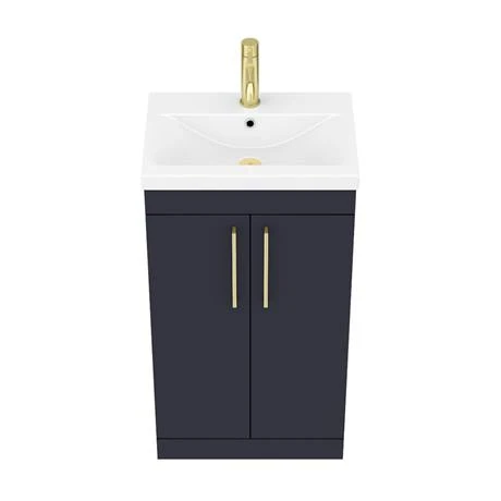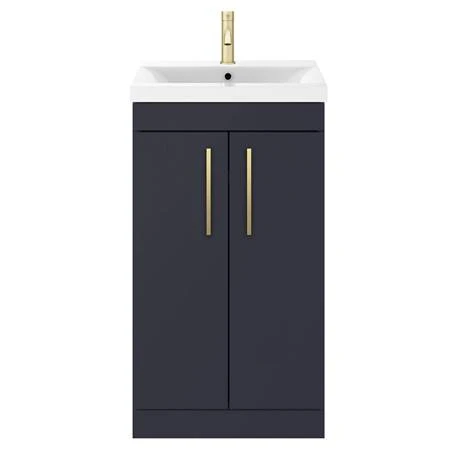 • The Arezzo 500 Matt Blue Floor Standing Vanity Unit combines style and functionality with its sleek matt blue finish and elegant brushed brass handles.