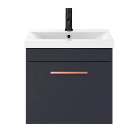 The contemporary matt blue Arezzo furniture range, with it’s clean lines this vanity unit is perfect for renewing the style in any bathroom. It’s stylish modern design hides all unsightly pipework creating a neat modern look. The units soft-closing drawer provides plenty of storage space for toiletries. Features an eye-catching and stylish matt blue finish with a on-trend minimalist rose gold square bar handle.
