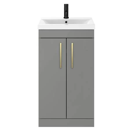 The contemporary matt grey Arezzo furniture range, with it’s clean lines this vanity unit is perfect for renewing the style in any bathroom. It’s stylish modern design hides all unsightly pipework creating a neat modern look. A internal shelf provides generous storage space for your toiletries, helping to keep your bathroom clutter free. Features an eye-catching and stylish matt grey finish with on-trend minimalist brushed brass square bar handles.