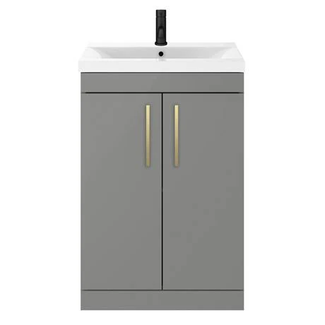 The contemporary matt grey Arezzo furniture range, with it’s clean lines this vanity unit is perfect for renewing the style in any bathroom. It’s stylish modern design hides all unsightly pipework creating a neat modern look. A internal shelf provides generous storage space for your toiletries, helping to keep your bathroom clutter free. Features an eye-catching and stylish matt grey finish with on-trend minimalist brushed brass square bar handles.