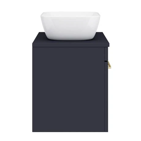 The contemporary matt blue Arezzo furniture range, with it’s clean lines this vanity unit is perfect for renewing the style in any bathroom. Supplied with a gloss white curved rectangular no tap hole counter top basin, it’s stylish modern design hides all unsightly pipework creating a neat modern look. A soft close drawer provides generous storage space for your toiletries, helping to keep your bathroom clutter free. Features a eye-catching and stylish matt blue finish with a on-trend modern brushed brass square bar handle. This matt blue vanity and counter top basin will look especially smart with an Arezzo sleek wall mounted tap to really emphasise the contemporary look.