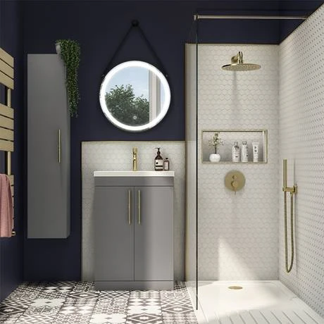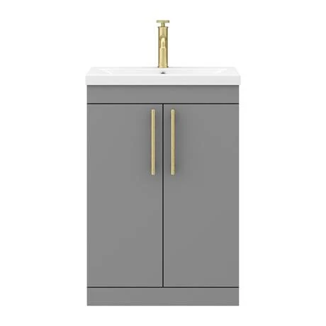 The contemporary matt grey Arezzo Industrial style furniture range, with it’s simple design this vanity unit is perfect for renewing the style in any bathroom. It’s stylish modern design hides all unsightly pipework creating a neat modern look. The units soft-closing doors provides plenty of storage space for toiletries. Features an eye-catching and stylish matt grey finish with on-trend round brushed brass knurled detail handles, great for creating an eye catching industrial look in your bathroom. Supplied with a quality 1 tap hole rectangular mid-edge ceramic sink.