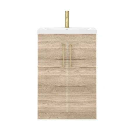 The contemporary rustic oak effect Arezzo furniture range, displays striking distressing with knots, deep cracks and grain to recreate a natural, authentic look. This 600mm wide vanity unit is perfect for renewing the style in any bathroom. It’s stylish modern design hides all unsightly pipework creating a neat modern look. A internal shelf provides generous storage space for your toiletries, helping to keep your bathroom clutter free. Cabinet features eye-catching contrasting modern brushed brass square bar handles.