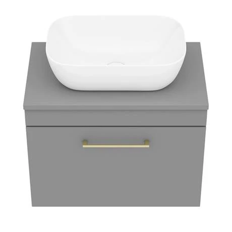 The contemporary matt grey Arezzo furniture range, with it’s clean lines this vanity unit is perfect for renewing the style in any bathroom. Supplied with a gloss white curved rectangular no tap hole counter top basin, it’s stylish modern design hides all unsightly pipework creating a neat modern look. A soft close drawer provides generous storage space for your toiletries, helping to keep your bathroom clutter free. Features a eye-catching and stylish matt grey finish with a on-trend modern brushed brass square bar handle. This matt grey vanity with counter top basin will look especially smart with an Arezzo sleek wall mounted tap to really emphasise the contemporary look.