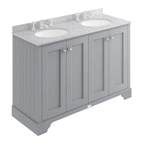 The Bayswater Plummett Grey 1200mm 4 Door Vanity Unit and Grey Marble Double Bowl Basin Top will create a unique centre piece to any classic themed bathroom. It’s ample storage space provides plenty of room for bathroom essentials while the soft close doors limits the daily wear and tear and provides a quieter closing action. Made from high quality materials, it features side panelling for a classic look, elegant chrome knobs and a Bayswater logo plate that beautifully finishes the unit. The stunning grey marble double bowl basin top co-ordinates beautifully with the classic white china basin.