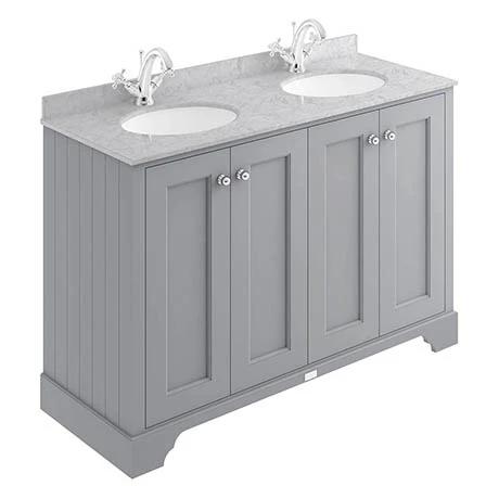 The Bayswater Plummett Grey 1200mm 4 Door Vanity Unit and Grey Marble Double Bowl Basin Top will create a unique centre piece to any classic themed bathroom. It’s ample storage space provides plenty of room for bathroom essentials while the soft close doors limits the daily wear and tear and provides a quieter closing action. Made from high quality materials, it features side panelling for a classic look, elegant chrome knobs and a Bayswater logo plate that beautifully finishes the unit. The stunning grey marble top basin co-ordinates beautifully with the classic white china basin.