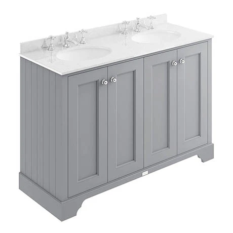 The Bayswater Plummett Grey 1200mm 4 Door Vanity Unit and White Marble Double Bowl Basin Top will create a unique centre piece to any classic themed bathroom. It’s ample storage space provides plenty of room for bathroom essentials while the soft close doors limits the daily wear and tear and provides a quieter closing action. Made from high quality materials, it features side panelling for a classic look, elegant chrome knobs and a Bayswater logo plate that beautifully finishes the unit. The stunning white marble double bowl basin top co-ordinates beautifully with the classic white china basin.