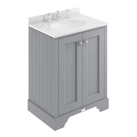 The Bayswater Plummett Grey 600mm 2 Door Vanity Unit and White Marble Basin Top will create a unique centre piece to any classic themed bathroom. It’s ample storage space provides plenty of room for bathroom essentials while the soft close doors limits the daily wear and tear and provides a quieter closing action. Made from high quality materials, it features side panelling for a classic look and an elegant chrome knob and Bayswater logo plate that beautifully finishes the unit. The stunning white marble top basin co-ordinates beautifully with the classic white china basin.
