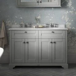 The Bayswater Pointing White 1200mm 4 Door Vanity Unit and White Marble Double Bowl Basin Top will create a unique centre piece to any classic themed bathroom. It’s ample storage space provides plenty of room for bathroom essentials while the soft close doors limits the daily wear and tear and provides a quieter closing action. Made from high quality materials, it features side panelling for a classic look, elegant chrome knobs and a Bayswater logo plate that beautifully finishes the unit. The stunning white marble double bowl basin top co-ordinates beautifully with the classic white china basin.
