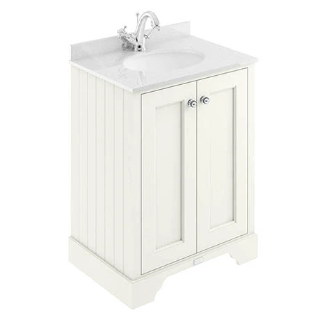 The Bayswater Pointing White 600mm 2 Door Vanity Unit and White Marble Basin Top will create a unique centre piece to any classic themed bathroom. It’s ample storage space provides plenty of room for bathroom essentials while the soft close doors limits the daily wear and tear and provides a quieter closing action. Made from high quality materials, it features side panelling for a classic look and an elegant chrome knob and Bayswater logo plate that beautifully finishes the unit. The stunning white marble top basin co-ordinates beautifully with the classic white china basin.