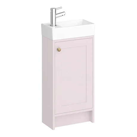 Make the absolute most of your compact space with the compact and functional 400mm wide pink Bromley traditional cloakroom vanity unit. This freestanding space-saving vanity unit includes a high quality ceramic basin with a single tap hole. It’s panelled with tongue and groove in a simple, Victorian inspired style, and the doorknobs have an brushed brass effect finish. Deceptively spacious inside, there’s an adjustable shelf for your bits and bobs. As a final flourish, this basin vanity unit has soft close doors to add a touch of luxe.