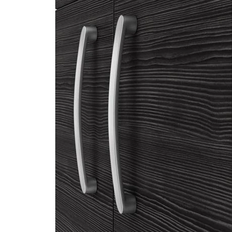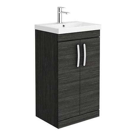 The Brooklyn modular furniture range combines up to date looks with practical storage. Features two soft close doors and plenty of space for toiletries, the Brooklyn floor standing vanity unit is perfect for adding modern style to any bathroom. This high quality Black textured wood effect vanity unit is supplied with a sleek white gloss thin-edge ceramic basin. All units are provided with quality matt chrome handles.