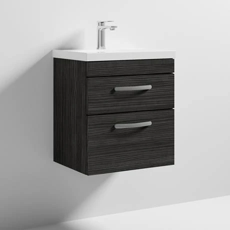 This 500mm wall hung vanity unit creates more space in your bathroom giving the illusion of a bigger bathroom, features 2 soft close drawers which provides plenty of storage space for toiletries, the Brooklyn wall hung vanity unit is perfect for adding modern style to any bathroom. This high quality Black Woodgrain textured wood effect vanity unit is supplied with a sleek gloss white thin-edge ceramic basin and a quality matt chrome handles.
