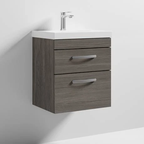 This 500mm wall hung vanity unit creates more space in your bathroom giving the illusion of a bigger bathroom, features 2 soft close drawers which provides plenty of storage space for toiletries, the Brooklyn wall hung vanity unit is perfect for adding modern style to any bathroom. This high quality Grey Brown Avola textured wood effect vanity unit is supplied with a sleek gloss white thin-edge ceramic basin and a quality matt chrome handles.Â