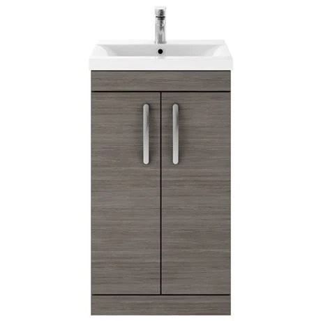 This 515mm wide Brooklyn Grey Avola Vanity Unit provides a clean and natural look in your bathroom. The grey textured Avola woodgrain gives the impression of authentic wood for a fraction of the price, while the colour contrasts elegantly with the bright white gloss basin. There’s ample room for toiletries behind the two soft close doors, designed to stop slamming and slow down wear and tear. The basin is made from durable vitreous china that will stand the test of time. Matt chrome handles on the doors are the final flourish on this compact basin vanity unit.