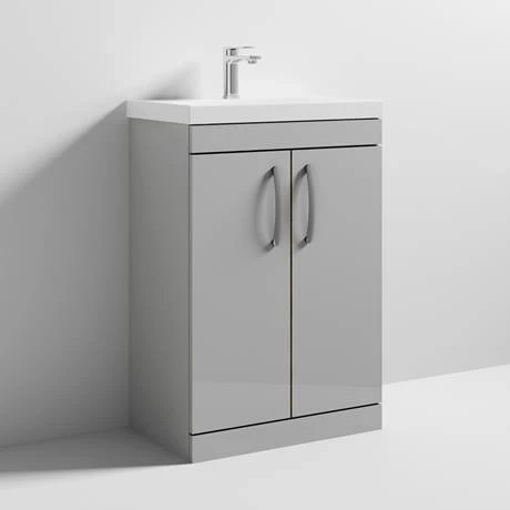 The Brooklyn modular furniture range combines up to date looks with practical storage. Features two soft close doors and plenty of space for toiletries, the Brooklyn floor standing vanity unit is perfect for adding modern style to any bathroom. This high quality gloss light grey vanity unit is supplied with a sleek white gloss thin-edge ceramic basin. All units are provided with quality matt chrome handles.