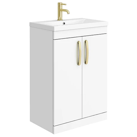 The Brooklyn gloss white modular furniture range combines up to date looks with practical storage. Features two soft close doors and provides plenty of storage space for toiletries, the Brooklyn 600mm wide floor standing vanity unit is perfect for adding modern style to any bathroom. This high quality gloss white vanity unit is supplied with a smooth white gloss vitreous china 1 tap hole basin. All units are provided with quality brushed brass handles.