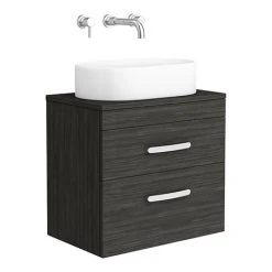 The Brooklyn modular furniture range combines up to date looks with practical storage, comes complete with a 510mm wide rounded counter top basin. Basin has no tap holes and is to be used alongside a counter or wall mounted outlet. Features 2 soft closing drawers providing plenty of space for toiletries, the Brooklyn wall hung vanity unit is perfect for adding modern style to any bathroom. This high quality Black Woodgrain textured wood effect unit is supplied with quality matt chrome handles.