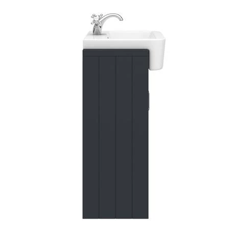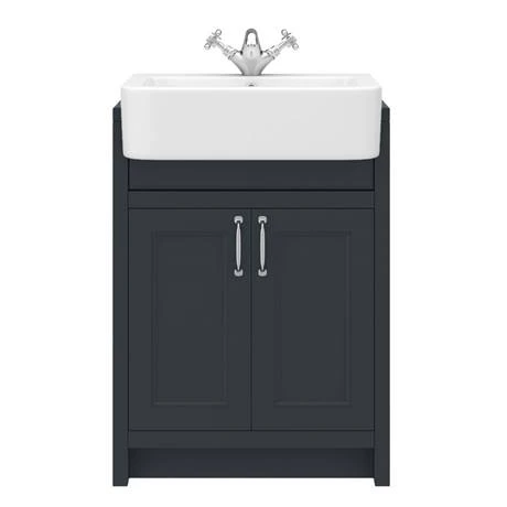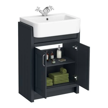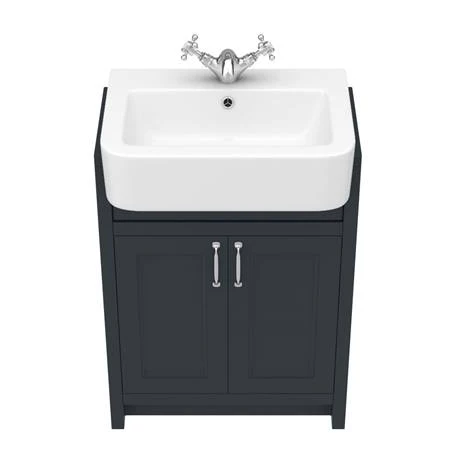 The eye-catching Chatsworth traditional 600mm wide off-black vanity unit with a gloss white semi-recessed basin, Victorian inspired design with a modern twist. The Chatsworth range of charming bathroom furniture features classic styling with a satin graphite finish cabinet and tongue-and-groove side panelling. The semi recessed basin will half sit in your unit.Â