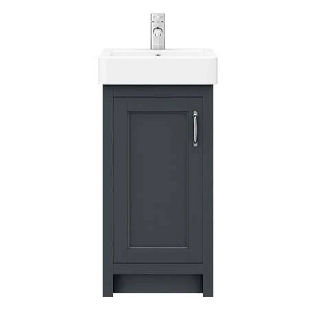 The Chatsworth traditional 425mm wide satin graphite vanity unit with gloss white basin, Victorian inspired design with a modern twist. The Chatsworth range of charming bathroom furniture features classic styling with a satin graphite finish cabinet and tongue-and-groove side panelling.