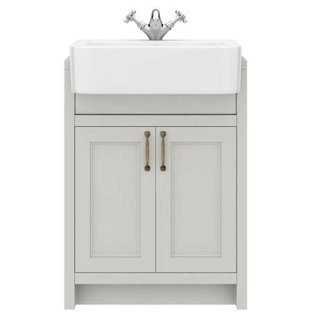 The eye-catching Chatsworth traditional 600mm wide grey vanity unit with a gloss white semi-recessed basin, Victorian inspired design with a modern twist. The Chatsworth range of charming bathroom furniture features classic styling with a satin grey finish cabinet and tongue-and-groove side panelling. The semi recessed basin will half sit in your unit.