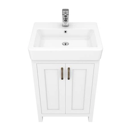 Tastefully panelled in satin white wood, the Chatsworth Traditional White Vanity unit will bring a touch of class to your bathroom. At 560mm wide it offers plenty of room to tuck toiletries away behind two soft closing doors. A squared basin crafted from durable ceramic sits on the top of the freestanding vanity unit while brass oxide finish handles provide easy access and an additional flourish. Add a luxurious tap to this basin vanity unit for a standout look – why not try the Monza Waterfall Basin Tap for its spa like cascading water effect?