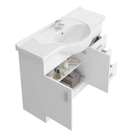This Cove White Large Vanity Unit offers bags of storage space for all your bathroom essentials. The 1060mm wide freestanding vanity unit features three roomy drawers plus a large spacious cupboard, all accessible via its sleek chrome handles. The unit is topped by a smooth ceramic sink that you can wipe clean in just a few seconds. There are even handy areas on both sides of the basin vanity unit for your toothbrush, toothpaste and soap. Why not complete this modern look with the Cruze Contemporary Basin Mixer in Chrome?