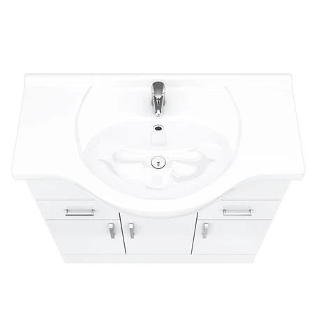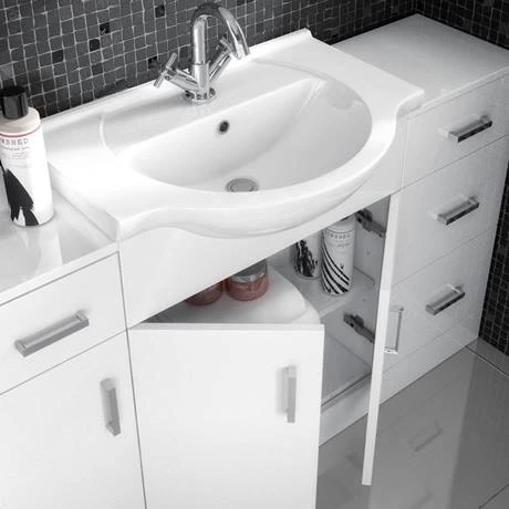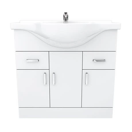 If you need a lot of storage, the Cove White Vanity Unit could well be the answer. Stretching 855mm wide, with two drawers and three cupboard compartments, this freestanding vanity unit has plenty of room for all of your bathroom essentials โ and room for non essentials too. Keep your surfaces free from clutter with this basin vanity unit and enjoy a minimalist look and a wonderfully tidy bathroom. The unit’s white gloss finish is smooth to the touch as well as giving it durability. It also comes fully assembled, which means you can save precious time on installation.