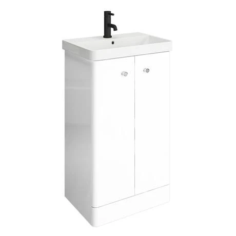 Make the most of compact bathrooms with the Cruze Curved Gloss White Vanity Unit. This 505mm wide freestanding vanity unit slots perfectly into a narrow room, adding a minimalist look with its curved edges, understated handles and pared back white gloss finish. As well as providing a convenient hand washing station, the basin vanity unit has two soft close doors concealing ample storage space for all your essentials. Pair with an Arezzo Round Matt Black Basin Mono Mixer Tap for a distinctly modern look in your bathroom.