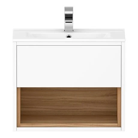 Create a focal point in your bathroom with this Haywood Gloss White and Natural Oak Wall Hung Vanity Unit. There’s plenty of room for storing your bathroom essentials in the practical soft closing drawer of this 500mm wide minimalist gloss white vanity unit – just give it a gentle push to open. A convenient exposed shelf with a contrasting oak effect finish allows quick access to your favourite toiletries. This durable unit is made from water-resistant melamine faced chipboard and topped with a contemporary single tap hole mid edged ceramic basin, giving a boutique feel.