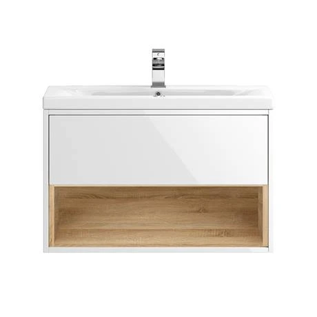 The minimalist Haywood gloss white and natural oak effect wall hung vanity unit is ideal for adding a sophisticated touch to any bathroom. Features a spacious highly practical soft closing drawer and a stylish single tap hole mid-edged ceramic basin top. The Haywood furniture range is great for creating a bathroom space that is fresh, modern and unique.