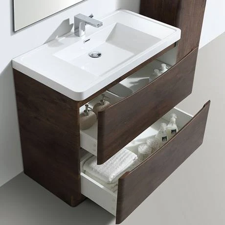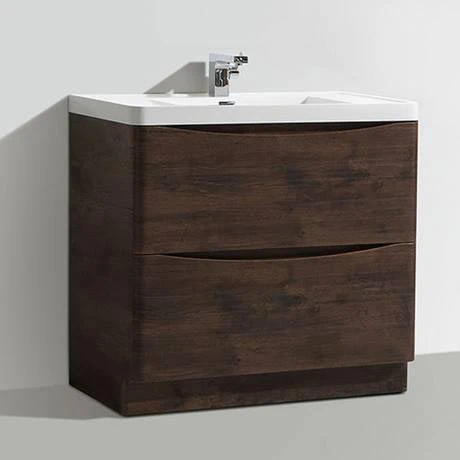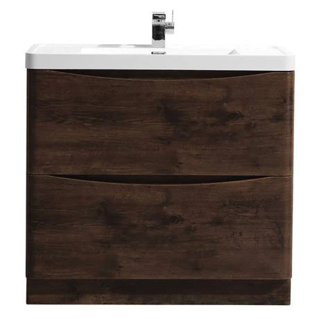 The modern Monza chestnut wood effect floor standing vanity unit with a 900mm wide poly marble basin, features a minimalist handle-less cabinet with 2 large functional soft closing drawers providing plenty of storage space and a matching rounded corner basin top. It’s neutral colour scheme and use of light and warmth finishes make this vanity unit suitable for any style of bathroom.