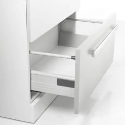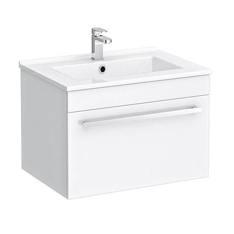 Add a boutique hotel feel to your bathroom with the Nova Wall Hung Vanity Sink With Cabinet. This 505mm wide gloss white vanity unit features a minimalist rectangular basin that adds a sleek look to your space. The slimline sink is crafted from robust ceramic for daily use. Open the drop down cupboard door of the wall hung vanity unit to reveal a convenient storage space โ handy for keeping your toiletries neatly organised. Moisture resistant MDF prevents damage from spills and splashes, while a modern matt aluminium bar handle completes the contemporary aesthetic.