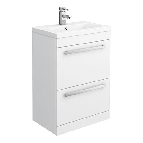 A minimalist 600mm floor standing vanity unit with quality stylish mid edge’ ceramic basin top, make the most of your bathroom with our practical and attractive modern white gloss furniture options.Â
