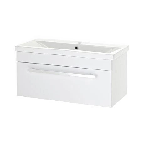 A minimalist 800mm wall mounted vanity unit with quality stylish mid edge’ ceramic basin top, make the most of your bathroom with our practical and attractive modern white gloss furniture options.Â