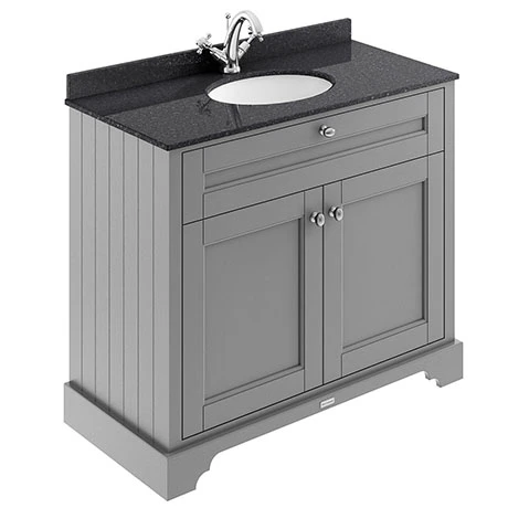 Add a cool touch of colour to your bathroom with this Storm Grey unit. It features soft close doors which limits the daily wear and tear and provides a quieter closing action. The luxury black polished marble top achieves a timeless, classic look. Ideal for creating a period look in your bathroom this furniture range with it’s clean classical design blends beautifully with Old London’s range of traditional bathroom furniture.