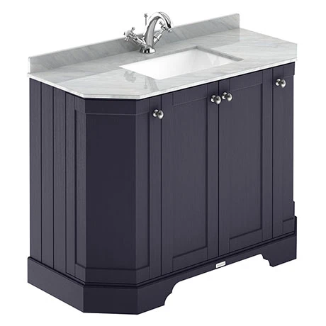 Old London furniture is the epitome of traditional design. This Art Deco styled Twilight Blue 1000mm Angled Cabinet features soft close doors which limits the daily wear and tear and provides a quieter closing action. The luxury Grey polished marble top achieves a timeless, classic look. Ideal for creating a period look in your bathroom this furniture range with it’s clean classical design blends beautifully with Old London’s range of traditional bathroom furniture.