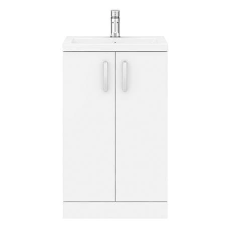 The Pallas 500 Gloss White Vanity Unit is a clever option for smaller bathrooms, en suites and cloakrooms. It includes a high quality ceramic basin that comes with an overflow to help prevent flooding, plus one tap hole to crown with the tap of your choosing. Behind soft closing doors, the integrated cupboard in this 500mm wide basin vanity unit provides plenty of space to store your bits and bobs. What’s more, the white gloss finish and chrome handles add an extra dash of contemporary grace to this freestanding vanity unit.