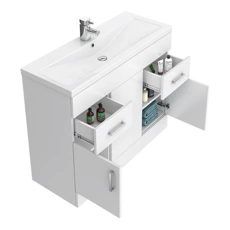 If you’re looking to declutter your bathroom, you’ll love the Toreno Basin Unit. The generous 1010mm wide proportions of this freestanding vanity unit will provide bags of storage for all your bathroom essentials. Keep them neatly stored in the unit’s two drawers and three cupboards. A high gloss white finish gives this piece a contemporary look, while its mid edge ceramic basin with gently sloping sides is a breeze to clean. Want to coordinate your bathroom look? Pair the modern basin vanity unit with the chic Toreno Mirror Cabinet for a smart and sleek aesthetic.