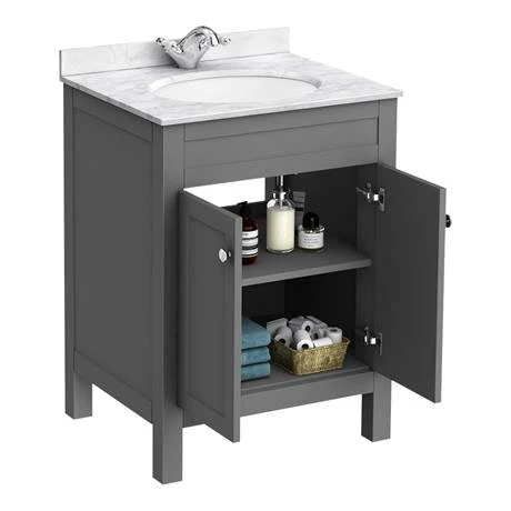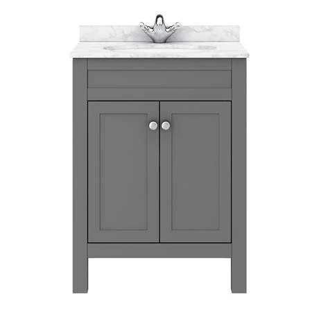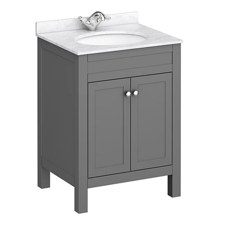 This chic grey bathroom furniture piece is manufactured from durable wood and comes supplied with a quality 610mm wide white marble effect work top with white ceramic insert basin.