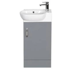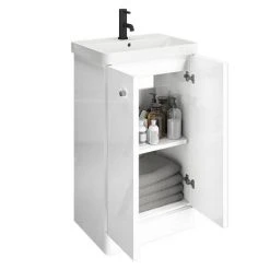 A 560mm wide high gloss white free standing vanity unit with a quality smooth ceramic basin top, part of the Venice range of bathroom furniture. Features soft closing doors with modern brushed brass door handles. Provides generous storage space for your toiletries, helping to keep your bathroom clutter free. Ideal for giving your bathroom a fresh clean modern look. Can be used in conjunction with 300mm depth furniture from the Venice range.