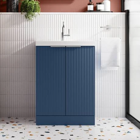 Create an Art Deco inspired bathroom with the Venice Fluted 600mm Blue 2 Door Floor Standing Vanity Unit. The units striking fluted front adds a modern twist. It has ample storage with its 2 large soft-closing doors to keep your toiletries organised. The mid-edged ceramic basin slots perfectly on top and all pipework is neatly concealed within the unit. Manufactured from quality materials, this vanity unit comes fully assembled and is finished in blue Satin.