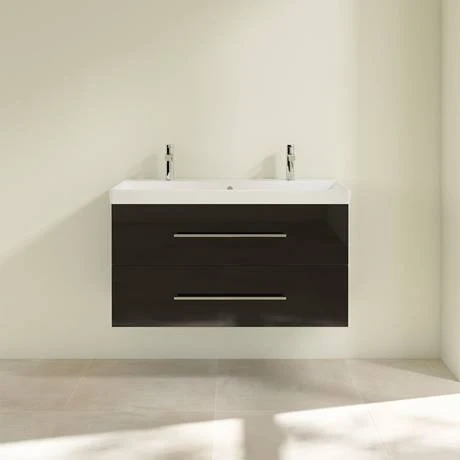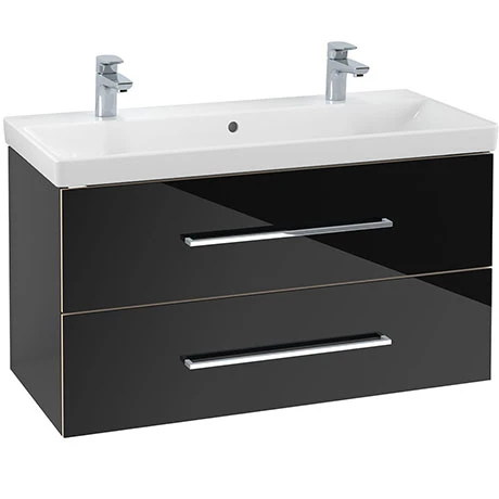 Villeroy & Boch Avento furniture is practical, beautiful and a real highlight in the bathroom. This Crystal Black 1000mm Wall Hung 2-Drawer Double Vanity Unit has generous storage space thanks to clever interior arrangement and its shock-absorbing, soft-closing drawers that slows down the drawer and automatically closes it, slowly and silently. The large basin offers a wash area for two people and features two tap holes for basin mixers. Visual highlights with champagne-coloured decorative edges and classy chrome handles give a light and modern look.