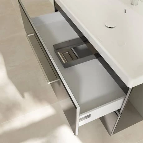 Villeroy & Boch Avento furniture is practical, beautiful and a real highlight in the bathroom. This Crystal Black 1000mm Wall Hung 2-Drawer Vanity Unit has generous storage space thanks to clever interior arrangement and its shock-absorbing, soft-closing drawers that slows down the drawer and automatically closes it, slowly and silently. The white ceramic basin offers a large wash area and features a single tap hole. Visual highlights with champagne-coloured decorative edges and classy chrome handles give a light and modern look.