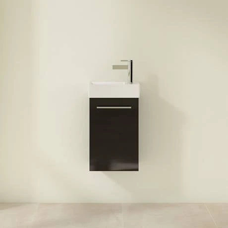 Villeroy & Boch Avento furniture is practical, beautiful and a real highlight in the bathroom. Thanks to its compact design, this Crystal Black 360mm Wall Hung Vanity Unit is ideal for cloakrooms or small bathrooms. The white ceramic basin features a left handed bowl and single tap hole. The door is fitted with soft close hinges and is available in a left or right hand opening.