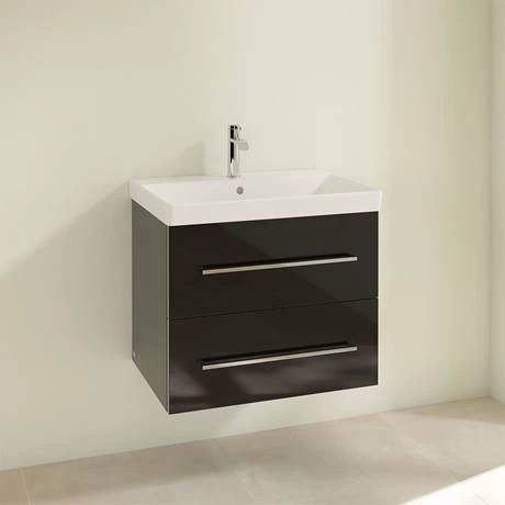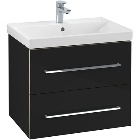 Villeroy & Boch Avento furniture is practical, beautiful and a real highlight in the bathroom. This Crystal Black 650mm Wall Hung 2-Drawer Vanity Unit has generous storage space thanks to clever interior arrangement and its shock-absorbing, soft-closing drawers that slows down the drawer and automatically closes it, slowly and silently. The white ceramic basin offers a generous wash area and features a single tap hole. Visual highlights with champagne-coloured decorative edges and classy chrome handles give a light and modern look.