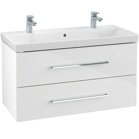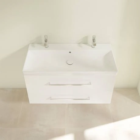 Villeroy & Boch Avento furniture is practical, beautiful and a real highlight in the bathroom. This Crystal White 1000mm Wall Hung 2-Drawer Double Vanity Unit has generous storage space thanks to clever interior arrangement and its shock-absorbing, soft-closing drawers that slows down the drawer and automatically closes it, slowly and silently. The large basin offers a wash area for two people and features two tap holes for basin mixers. Visual highlights with champagne-coloured decorative edges and classy chrome handles give a light and modern look.